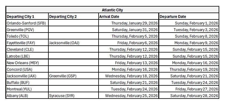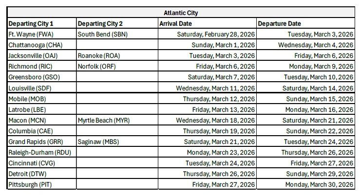 Can't find the city and date you want on our master calendar? Checkout our air charter schedule below for additional flights to the Caesars Entertainment Properties from other US cities.