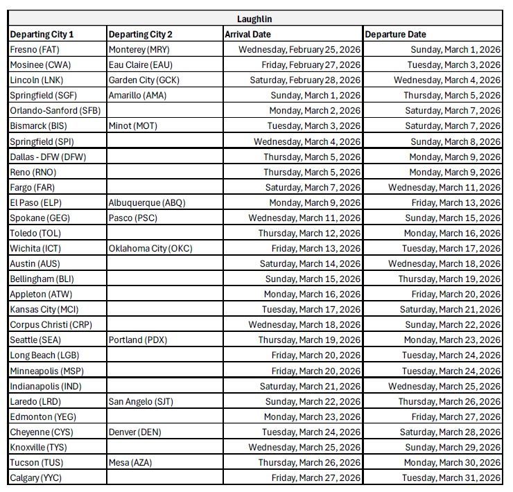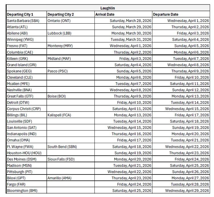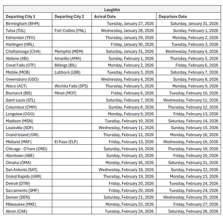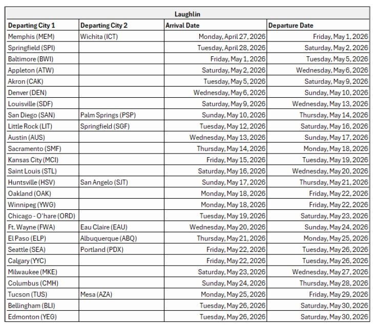 Can't find the city and date you want on our master calendar? Checkout our air charter schedule below for additional flights to the Caesars Entertainment Properties from other US cities.