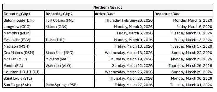 LAS - Las Vegas UNC= Bossier City UTU= Tunica NOR = New Orleans